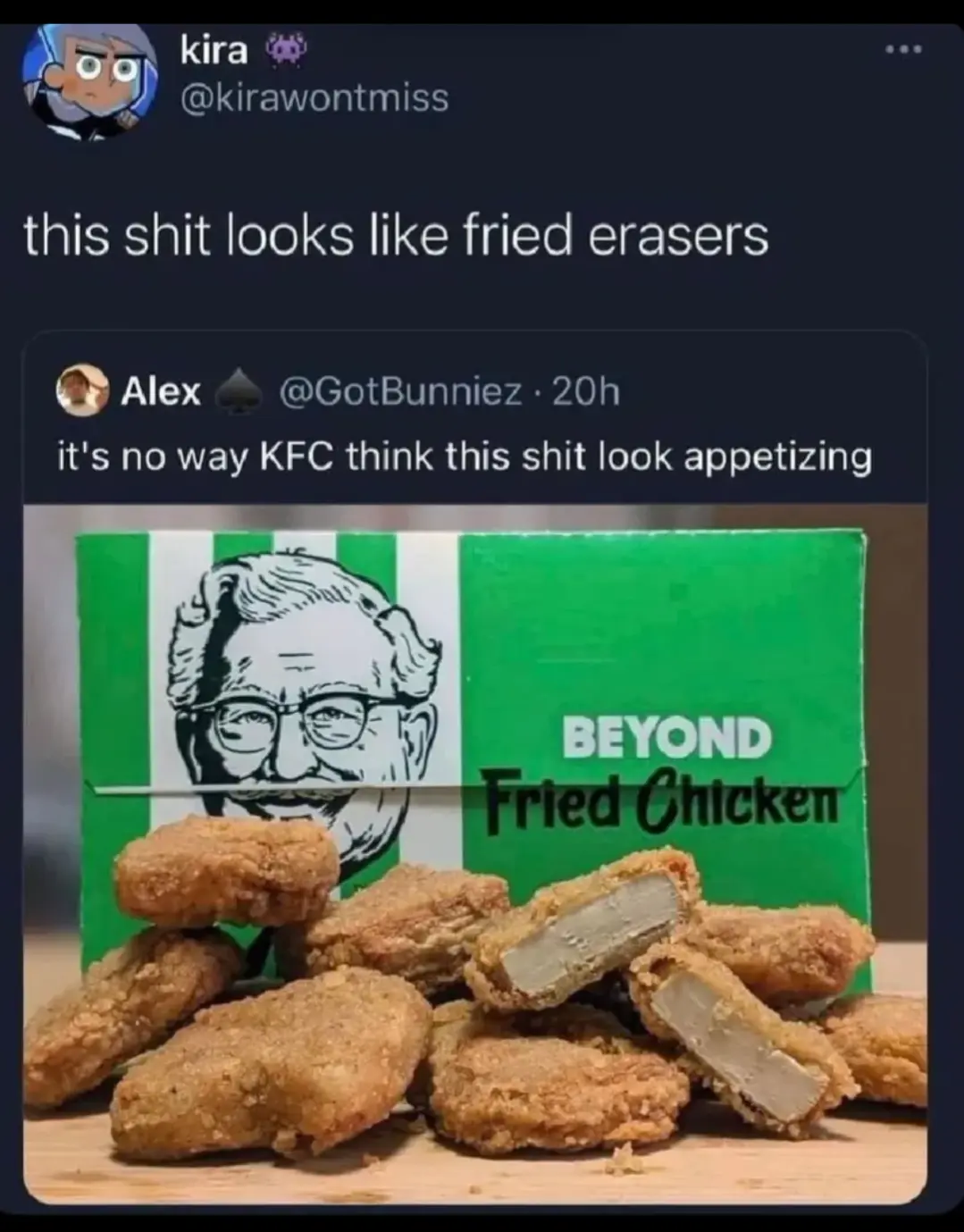 huh. that’s a worthwhile recommendation to me. i don’t eat chicken for reasons, but every once in a while i crave KFC. usually i just go to a german restaurant and order (or go home and make) some pork schnitzel and that does it for me, but i will have to try these impossible nuggets.