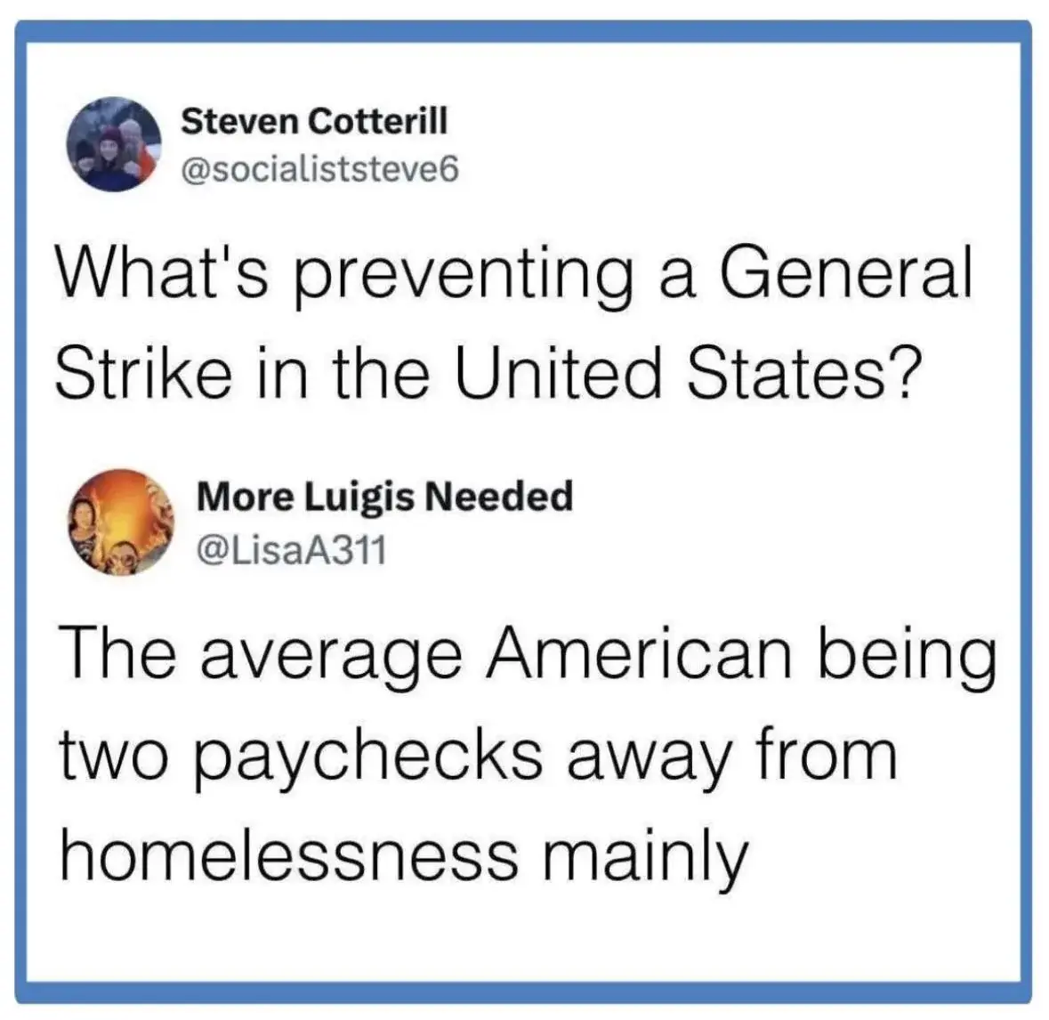 Americans have had every participatory inclination beaten out of them (metaphorically speaking). Their political parties have no participation beyond asking for money and their unions are the same. They’ve been fed a steady drip of 24/7 news designed to keep them afraid of everyone they don’t already know, and that’s by design. Things are going to have to get a lot worse for the average American before they’ll be willing to organize in any meaningful way. I hope this changes, don’t get me wrong, but I expect that it’ll have to get a lot worse before it gets better.