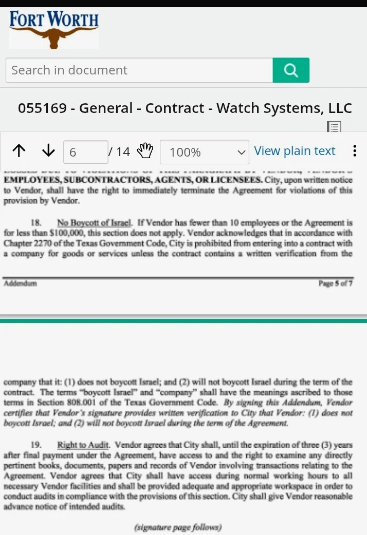 Oddly, as Christie also points out in the episode, an OffenderWatch/Watch System LLC contract with the city of Fort Worth, TX, contains an odd but potentially related paragraph regarding vendors who boycott Israel: