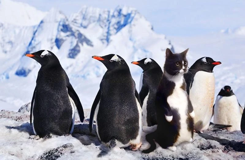 The cat is edited in the image with penguins. If you need, I can try to find the cat only too, I have seen the standing cat image too, somewhere.