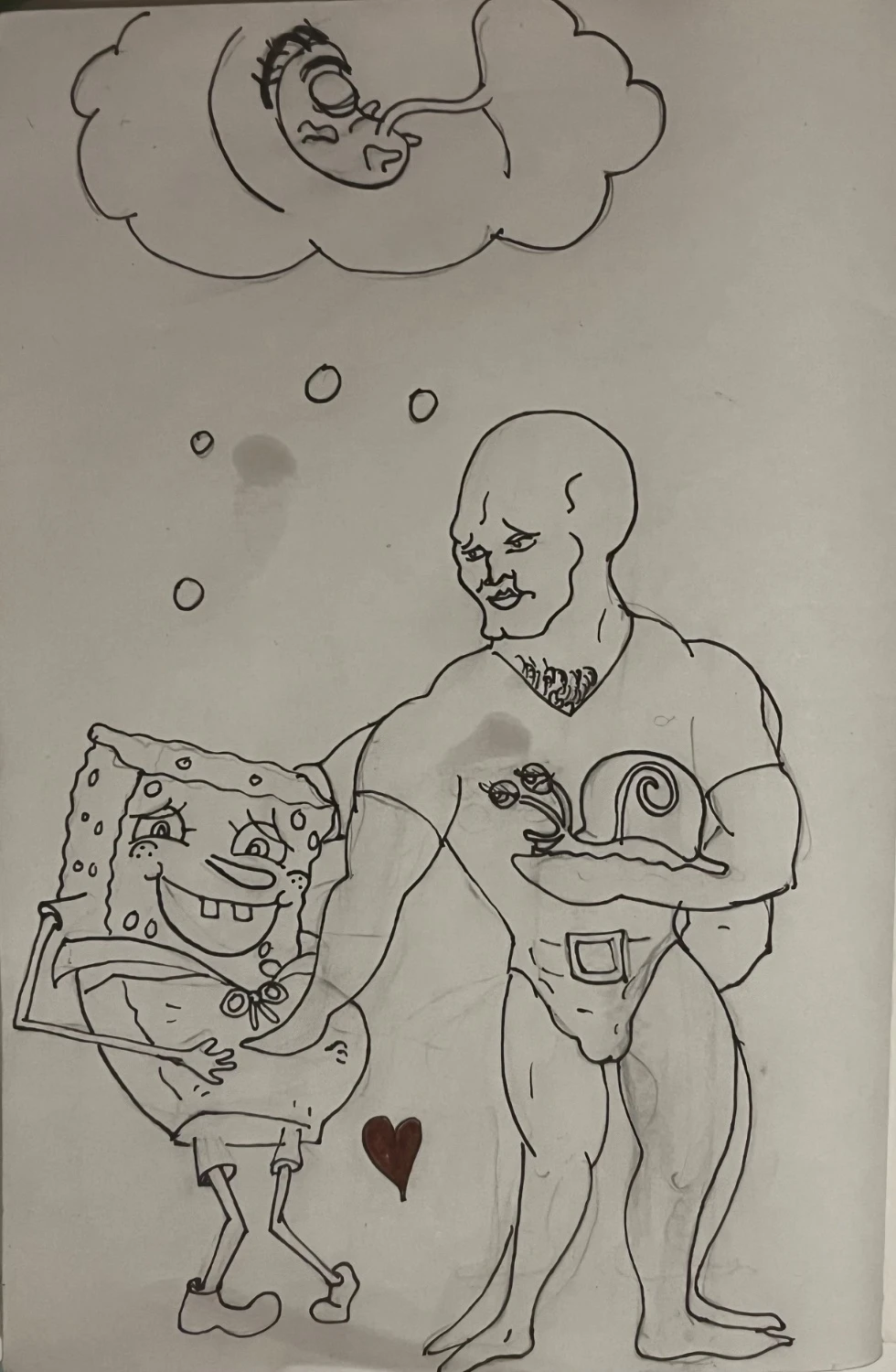 This is glorious. So many details to take in; handsome squidward, SpongeBob’s expression, Gary’s eyelashes, how dainty and peaceful little fetus plankton looks.