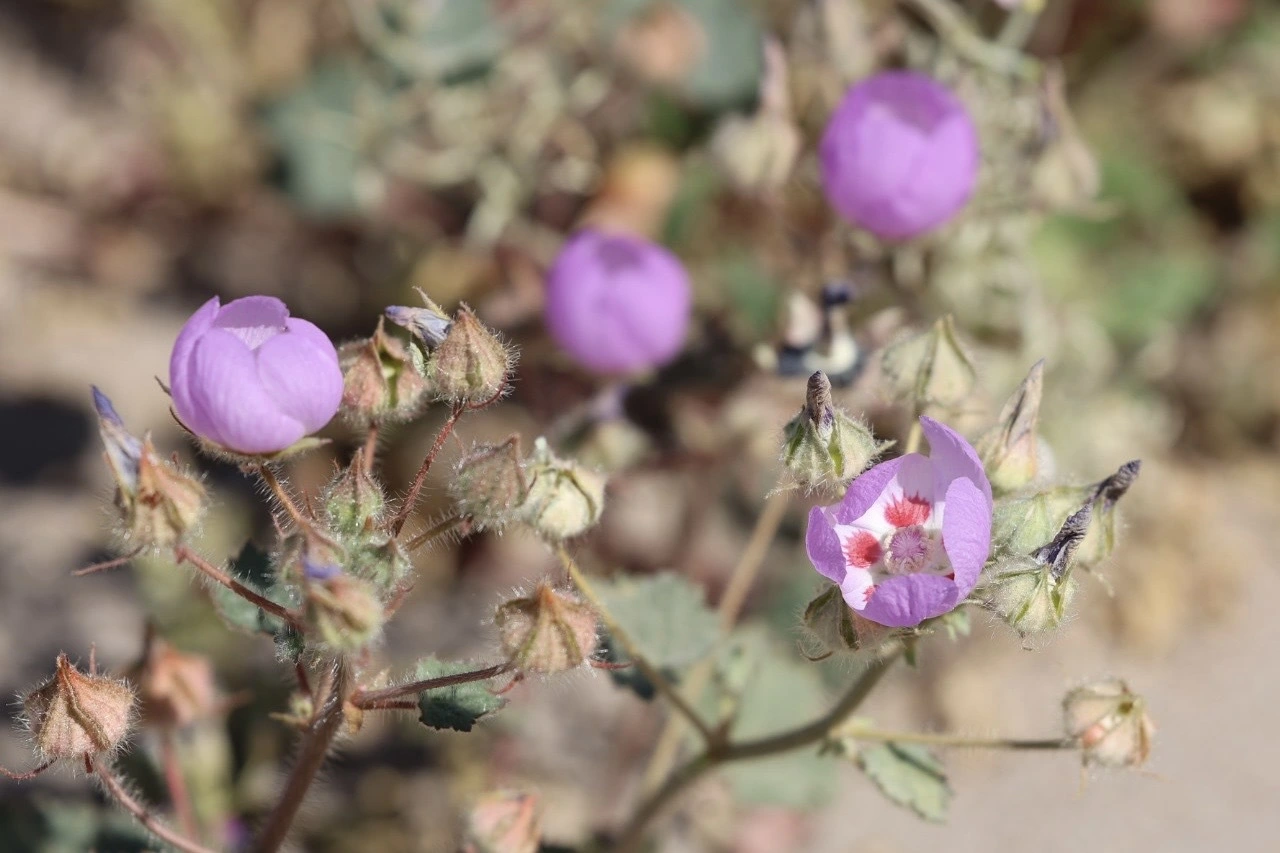 Several blooming Desert-five spot flowers in abloom of purple-pink, surrounded by unopened buds. One flower may be seen fully opened and exposing some of the beautiful interior red spots.