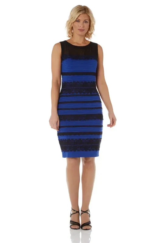 The dress was confirmed as a royal blue “Lace Bodycon Dress” from the retailer Roman Originals. The dress is black and blue; although it was available in three other colours (red, pink, and ivory, each with black lace), a white and gold version was not available at the time.