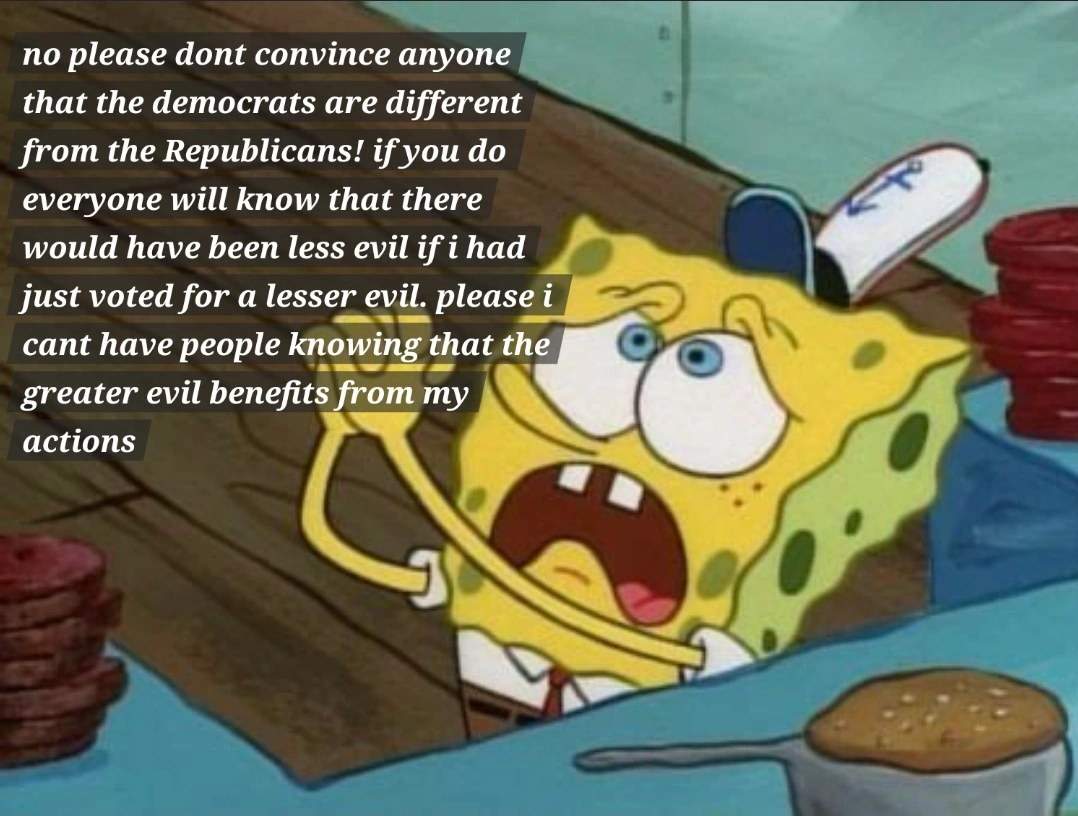 0·1 month agoHey so its actually that we have 2 years to uplift leftwing ideals until the general election, at which point we vote for the candidate who wants to bring the Torment Nexus levels down a little so that the Candidate who wants to double the Torment Nexus loses and we have a few years of lower torment while we uplift leftwing ideals again.